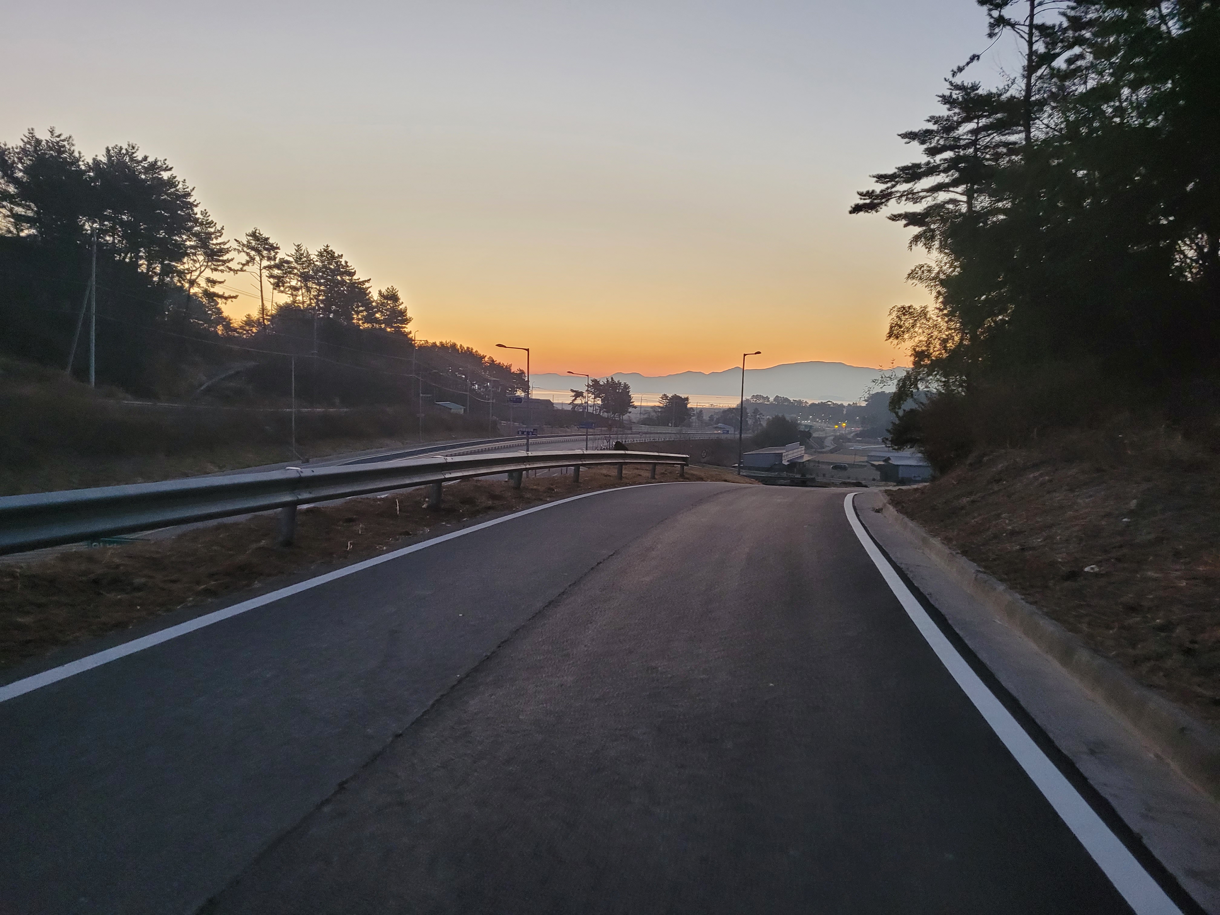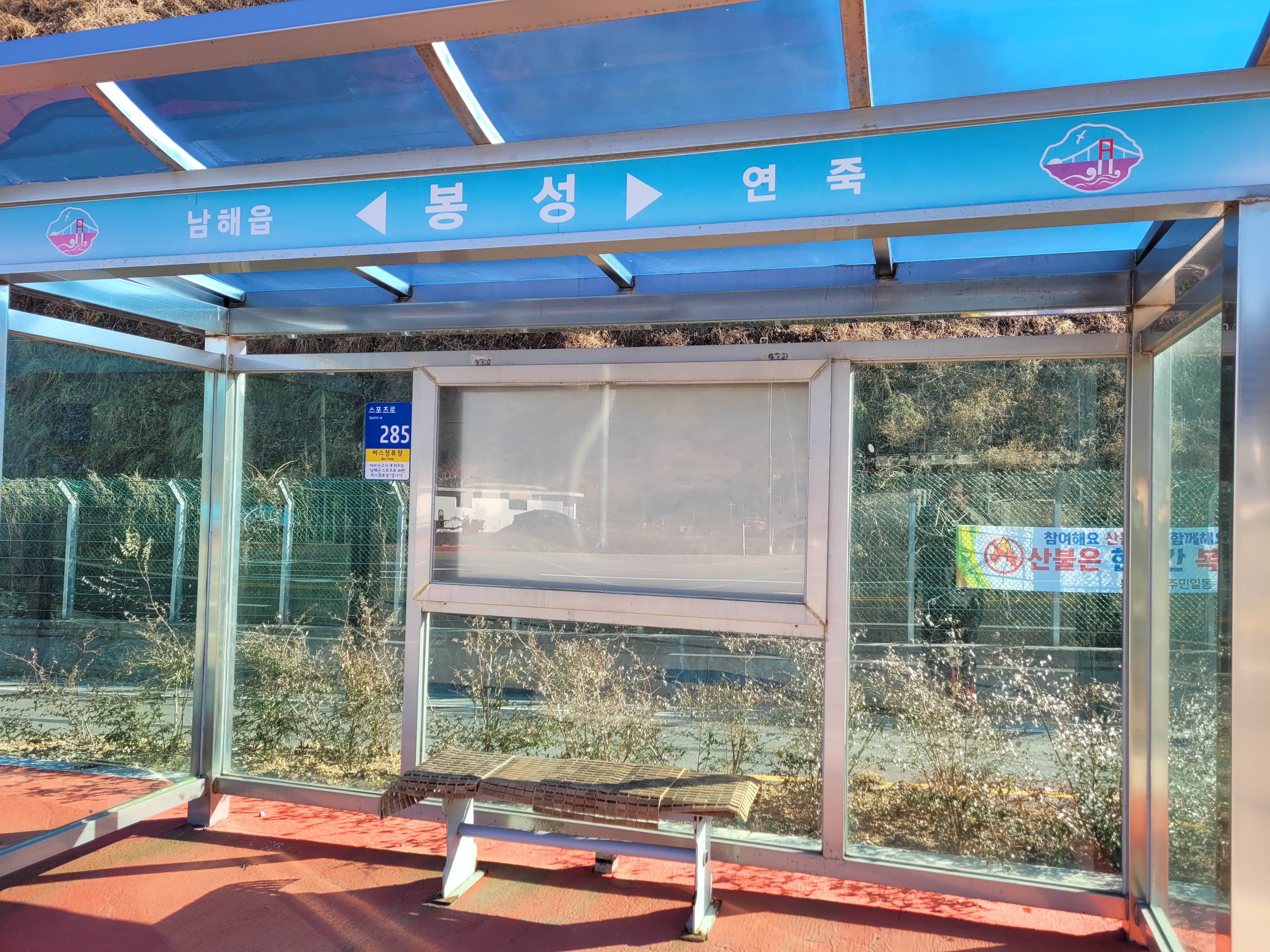 봉성 버스승강장에서 버스를 기다리는데, 빈 택시가 와서 택시를 타고 남해터미널로 가서 갈화선 14:35분 버스를 타고 오곡으로 가서 하차하여 차량을 회수하여 고현에서 1박을 한다.