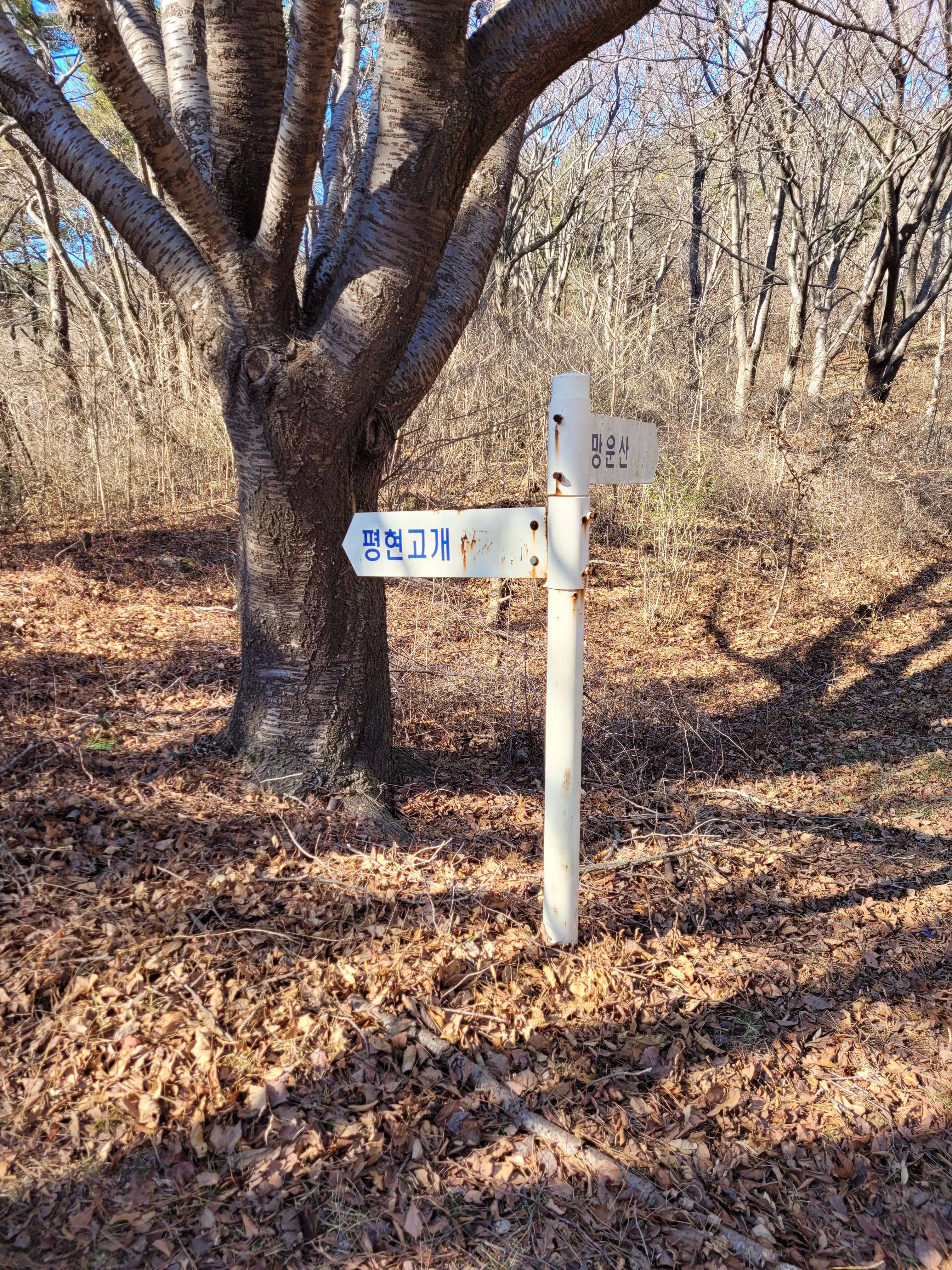 평현고개로 가는길을 지나쳐서 되돌아 간다. 이렇게 생긴 이정표를 만나면 평현고개 갈림길을 50m쯤 지난 것이다.