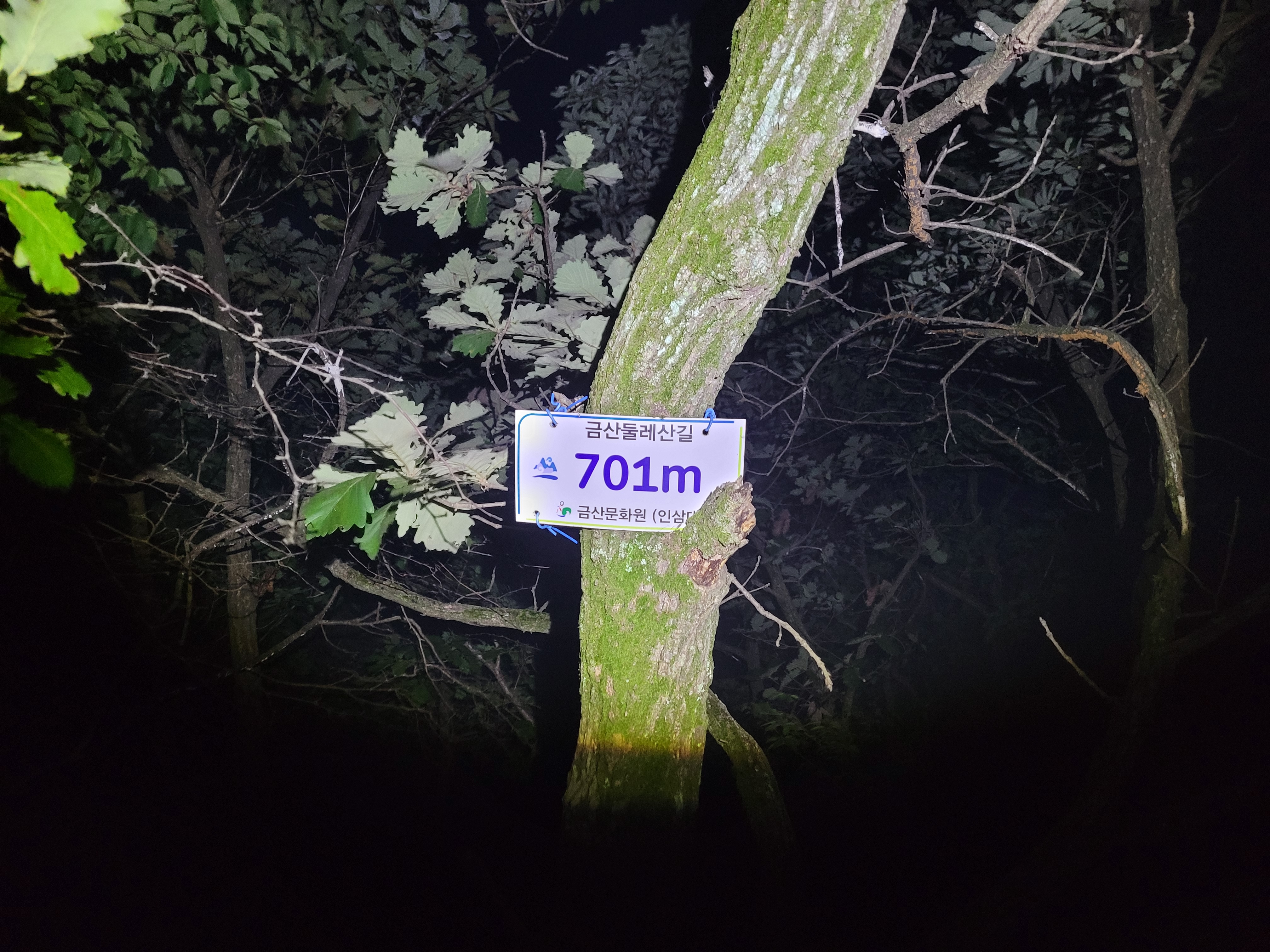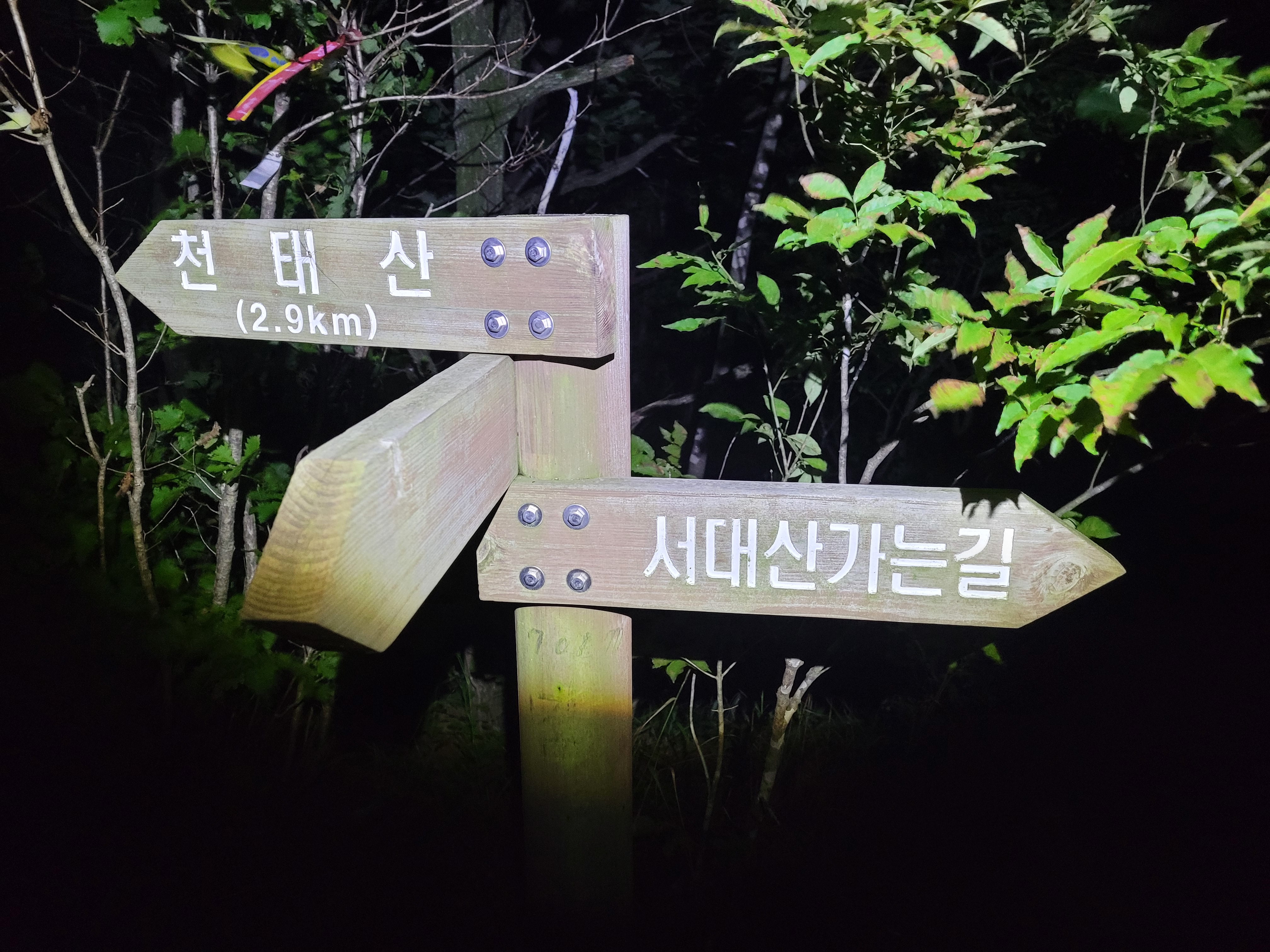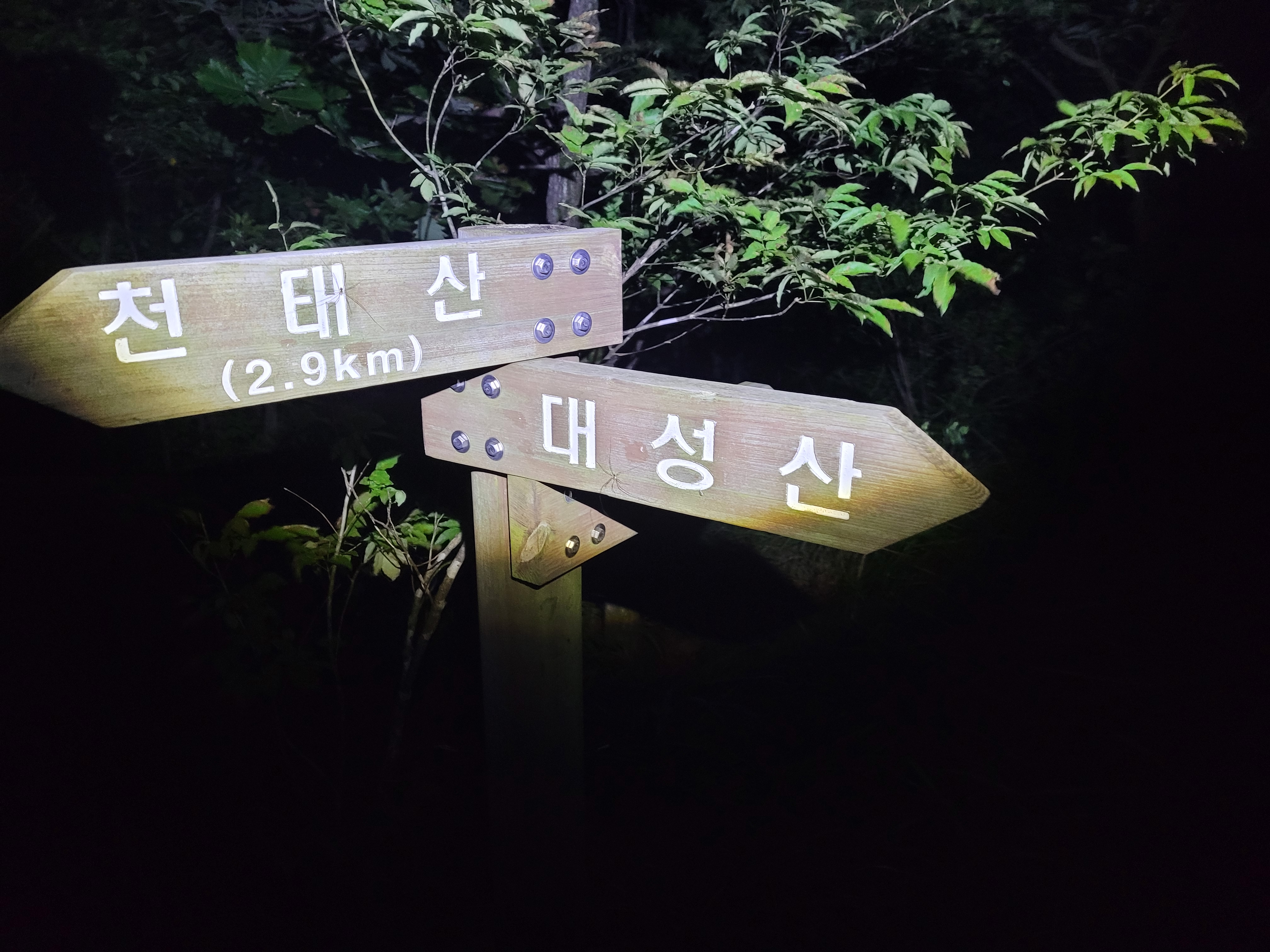 대성산 방향의 이정표이다. 대성산 방향으로 진행한다. 급경사 내림길을 내려가다가 어둠속에 길을 놓치고 좌측 급경사길로 조금 내려가다가 되돌아 올라와 우측방향으로 내려가는데, 급경사이지만 등로는 양호하다.