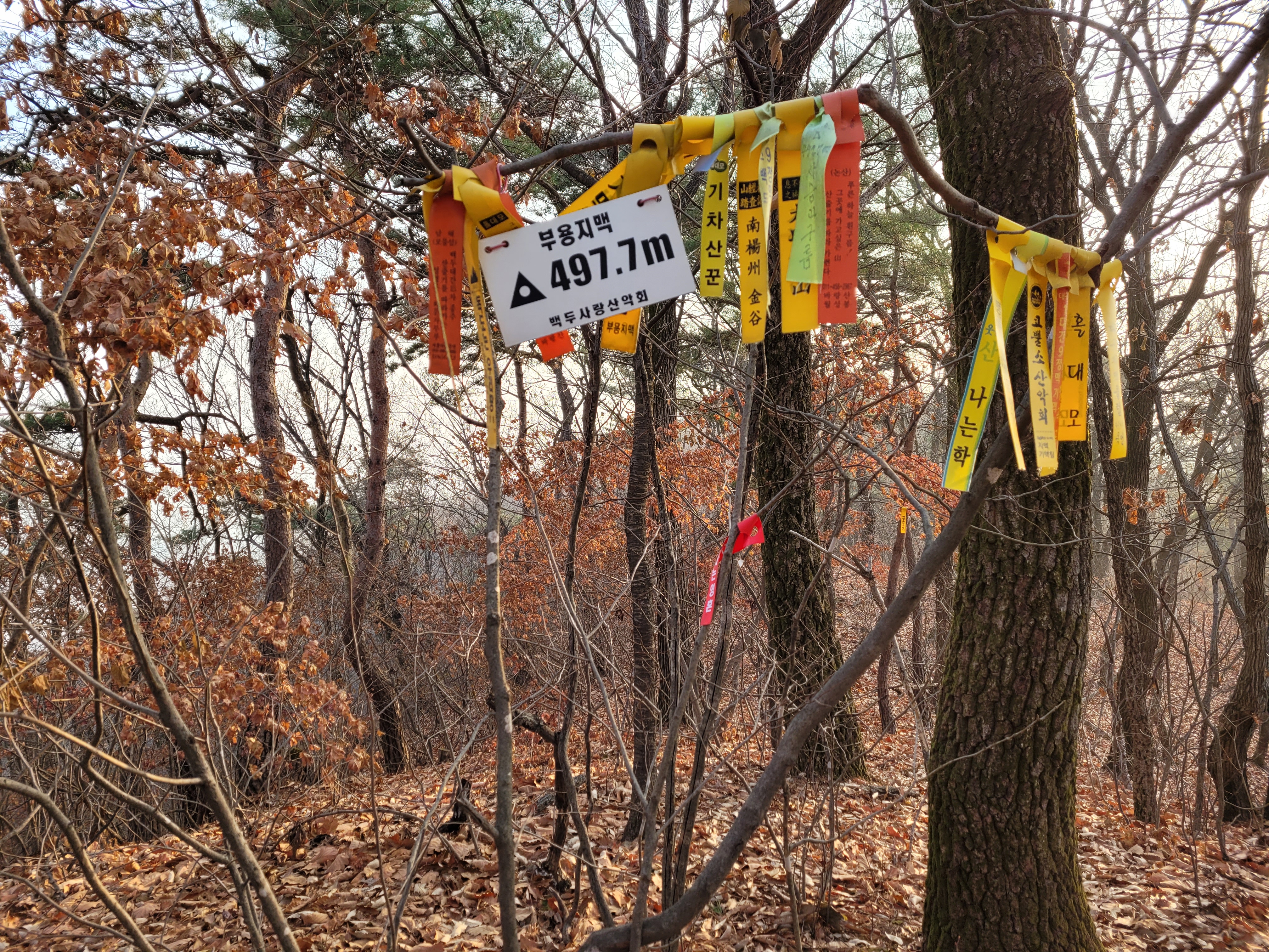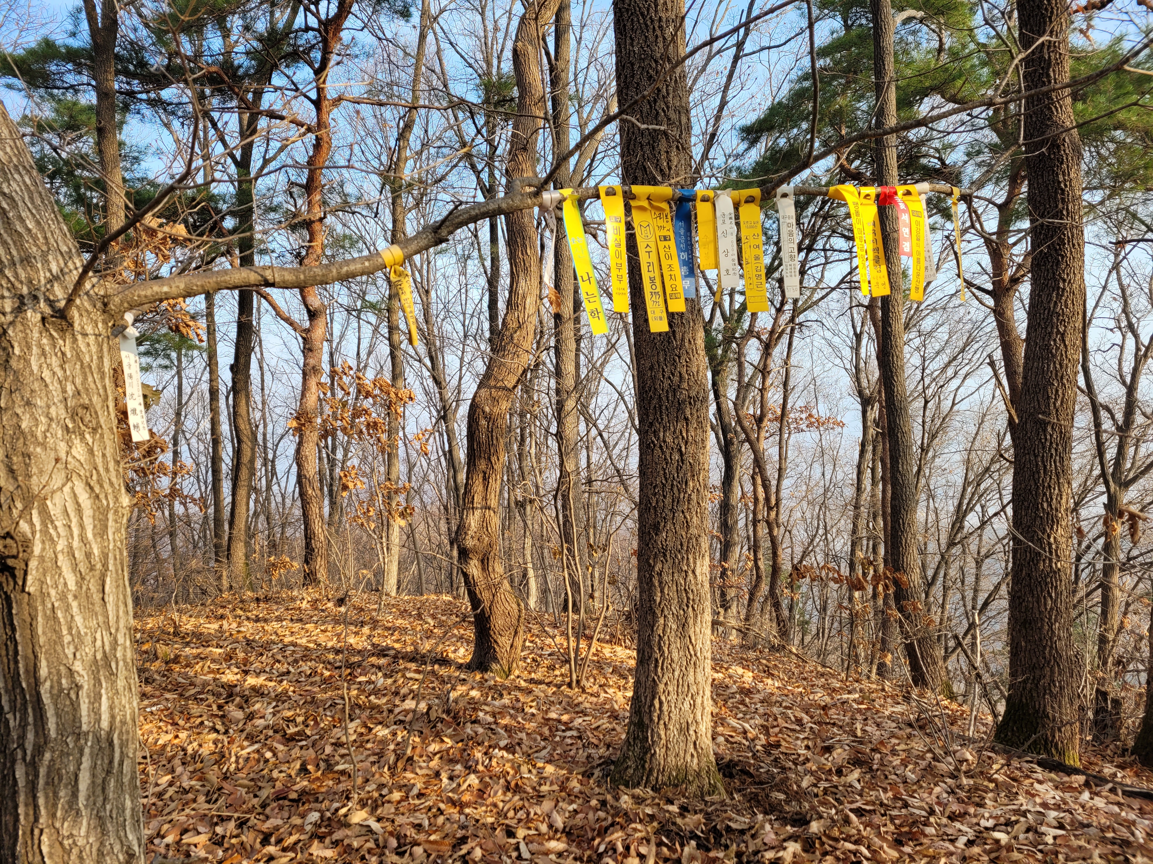 잡목을 헤치며 숭선고개에 내려선다. 다시 능선으로 오르는 초입에는 가시잡목이 심해 조심조심 진행하고, 이어 철탑길을 따라 양호한 등로를 오르내리며(때로는 잡목도 심함)